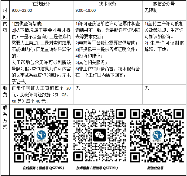 服務(wù)范圍 :提供查詢幫助和驗(yàn)證、許可證查詢異常處理、宣傳生產(chǎn)許可的相關(guān)政策法規(guī)、生產(chǎn)許可知識(shí)的咨詢。為減輕人工服務(wù)工作量,建議自助查詢;查詢時(shí)請(qǐng)參考查詢格式(幫助)